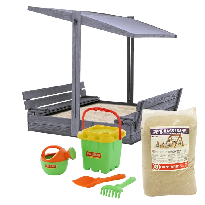Den rymliga sandlådan mäter cirka 120 x 120 x 22 cm och är tillverkad av 100 % PEFC-certifierat furuträ från europeiska skogar, grundmålad i en tidlös grå färg som smälter väl in i utemiljön. En central funktion är det praktiska locket som effektivt skyddar sanden mot smuts, löv och djur när den inte används, och som vid lekstundens början enkelt fälls upp för att förvandlas till två bekväma sittbänkar för barnen.