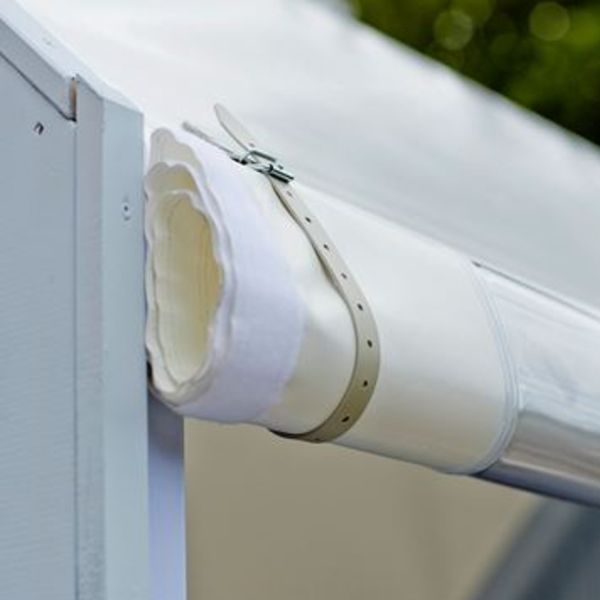 Tak och framsida består av en kraftig polyester duk med PVC beläggning 650gr/m2 som kan rullas upp.