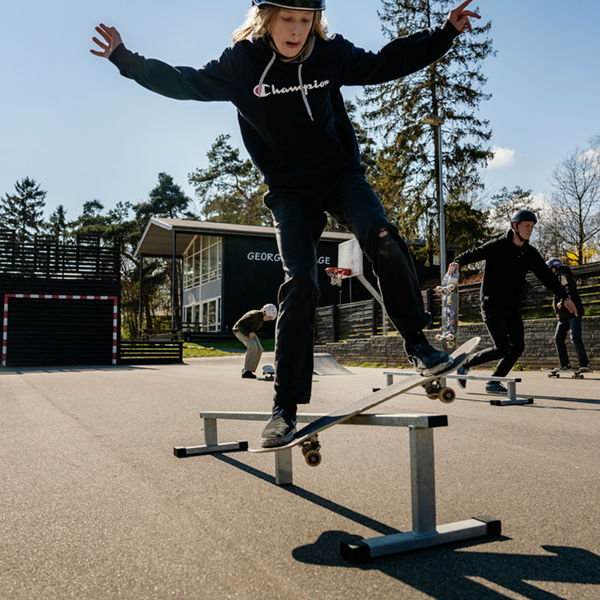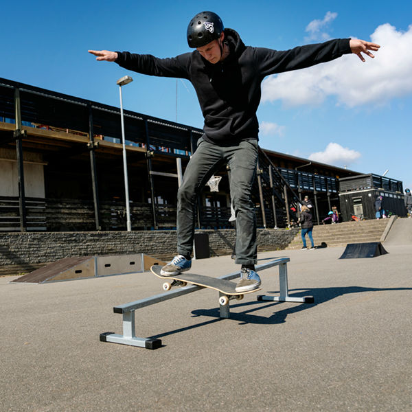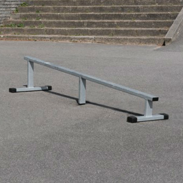 Ett skaterail med mått 200 x 6 cm och har en lutning från 35 till 20 cm.