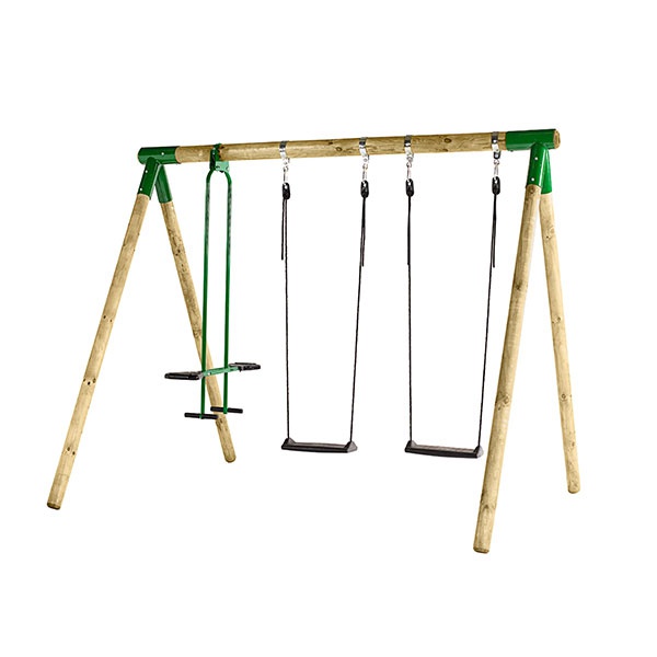 De helsvetsade infästningarna mellan ben och bom gör hela gungställningen mycket stabil. Kraftiga klämringar för upphängning av gungsitsarna. I gungställningen ingår två enkelgungor samt en dubbelgunga. Sitsarna är kraftiga med rundade kanter i UV-beständig plast. Fotstöden är i TPE-plast.