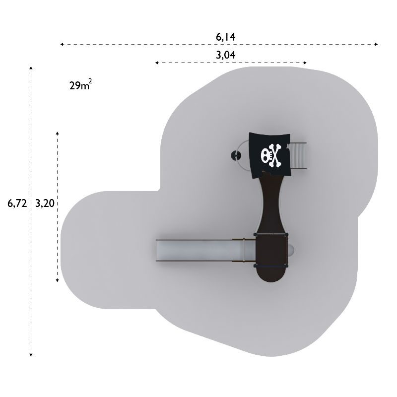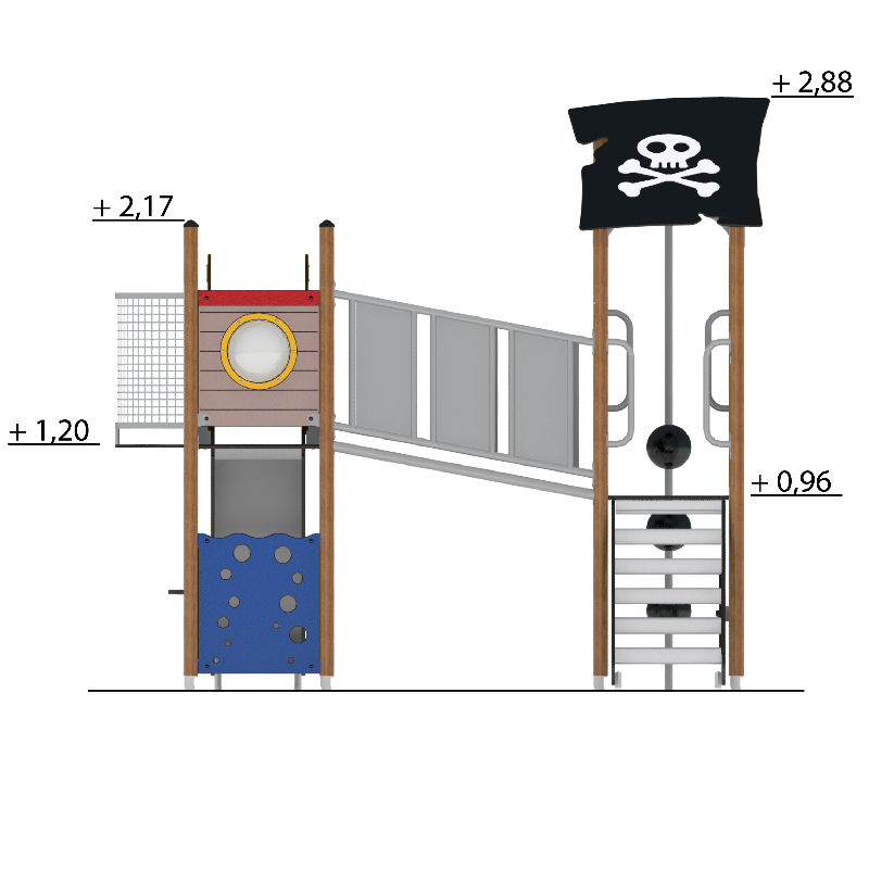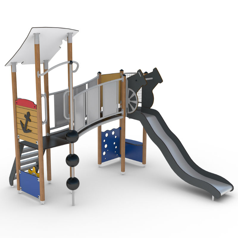 Ställningen har bland annat en rostfri rutschkana med ljuddämpande masonit, klätterstång och utkiksplats. Ställningen har även en lekskärmat tillverkad av HPL och trästolpar av Furu.