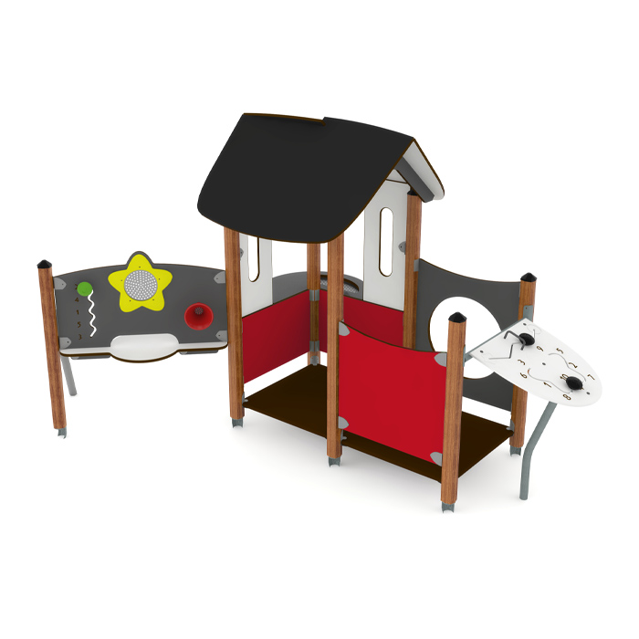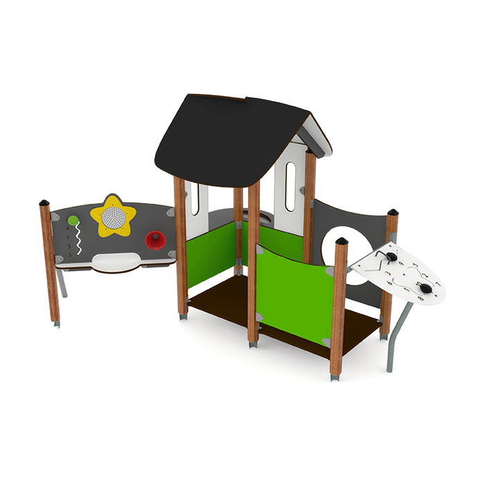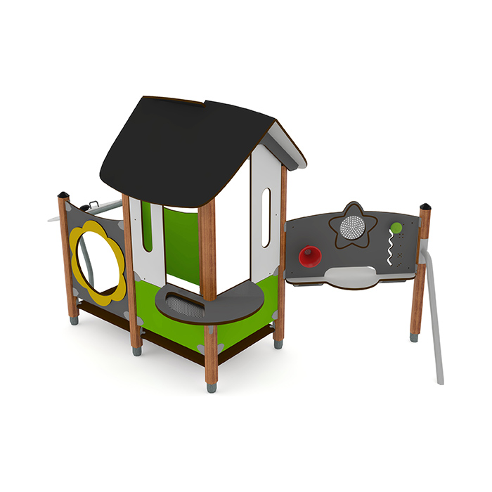Lekställning format som ett hus med en kiosk och två aktivitetstavlor där de yngre barnen kan leve ut sin fantasi, finns i grönt och rött utförande. Lekhuset Salle är lätt att montera och förankras genom nedgrävning.