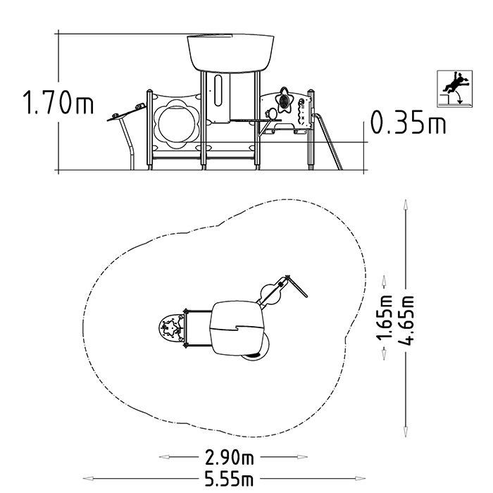 Tillverkat av HPL vilket har stor tålighet mot väder och slitage. Allt trävirke är träskyddsbehandlat enligt EN 351 klass P5 och Nordiska Träskyddsrådets anvisningar. Träskyddsbehandling sker efter all maskinbearbetning. Ytbehandling sker med 1x penetrerande grundlasyr och 1x filmbildande topplasyr Skall monteras på ett stötdämpande underlag enligt EN 1176.