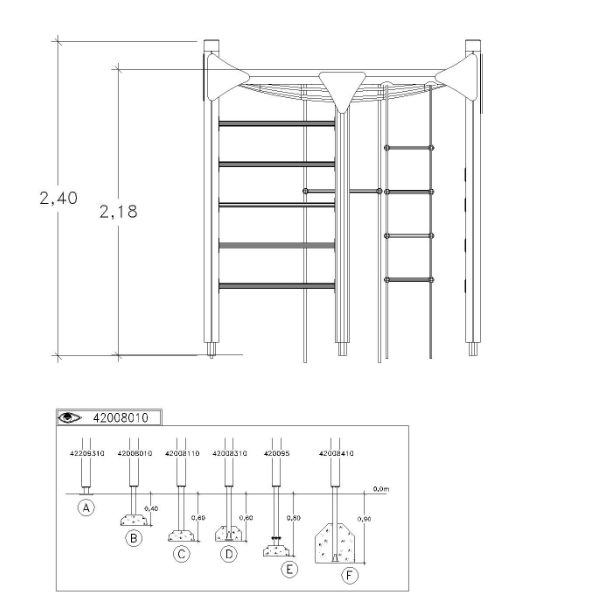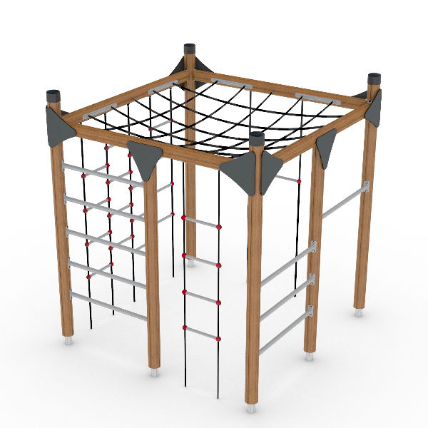 Klätterställningen är försedd med passgångslejdare tillverkad av varmförzinkad kätting beklädd med polyuretan och steg av strängpressad aluminium. Ställning har även en repstege, vilket är ett redskap som barn älskar att leka på. Klätterrepet är även en rolig detalj som är både rolig och utvecklande att leka med. Ovan ställningen finns ett nät där barnen älskar att klättra och vara. En annan rolig detalj är trapetsen som är mycket uppskattad av barn i alla åldrar.