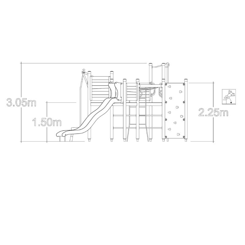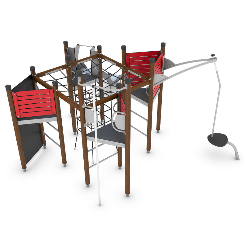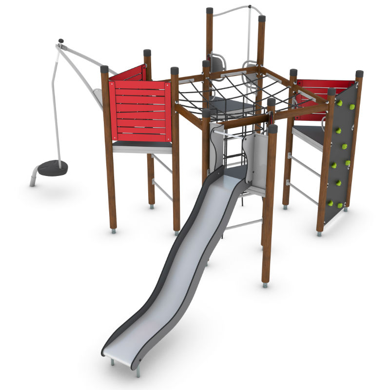 Lekställningen är försedd med blandannat en rutschbana, klätterställning, klätternät och en klättervägg . Klätterställningen består av kättingar som är beklädd med polyuretan. Rutschbana är tillverkad i rostfri plåt och försedd med oljehärdad masonit för ljuddämpning. Sammanfattningsvis är detta en komplett lekställning.