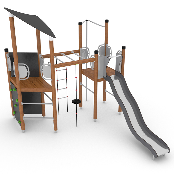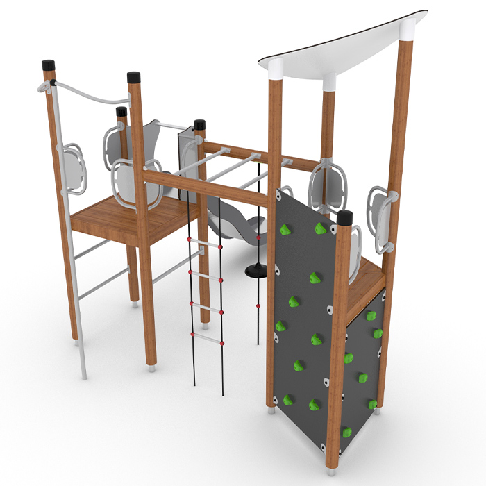 Lekställning för de större barnen med allt från klättervägg till rutschkana perfekt att träna upp barnen motorik samtidigt som fantasin flödar. Ta sig upp på ställningen kan göras på flera sätt, genom en stege, klättervägg eller stagen. Ner tar man sig antingen via rutschkanan alternativ brandstången.