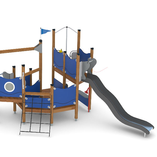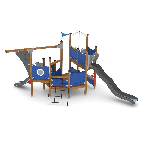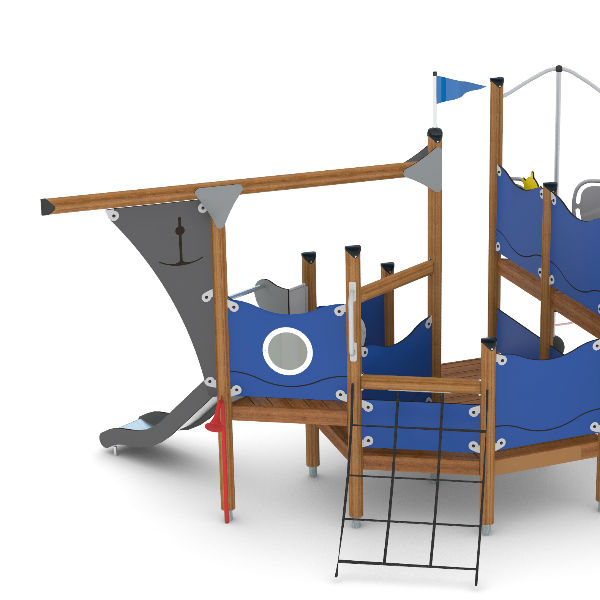 Lekställningen är försedd med två rutschbanor, klätterställningar, olika spel, skeppsratt butiksöppning, bollstång och talrör . Klätterställningen består av kättingar som är beklädd med polyuretan. Rutschbana är tillverkad i rostfri plåt och försedd med oljehärdad masonit för ljuddämpning. Båten har även olika parspel tillverkad av kraftig HPL. Butiksöppningen inbjuder till många olika lekar. Detta vikingaskeppa är en komplett lekställning som är mycket prisvärd.