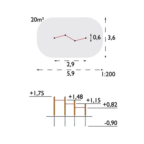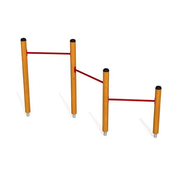 Volträcke med vinkelställda stolpar och räcken av pulverlackerade stålrör är något som bör finnas på var lekplats.