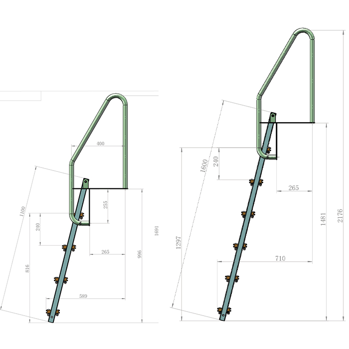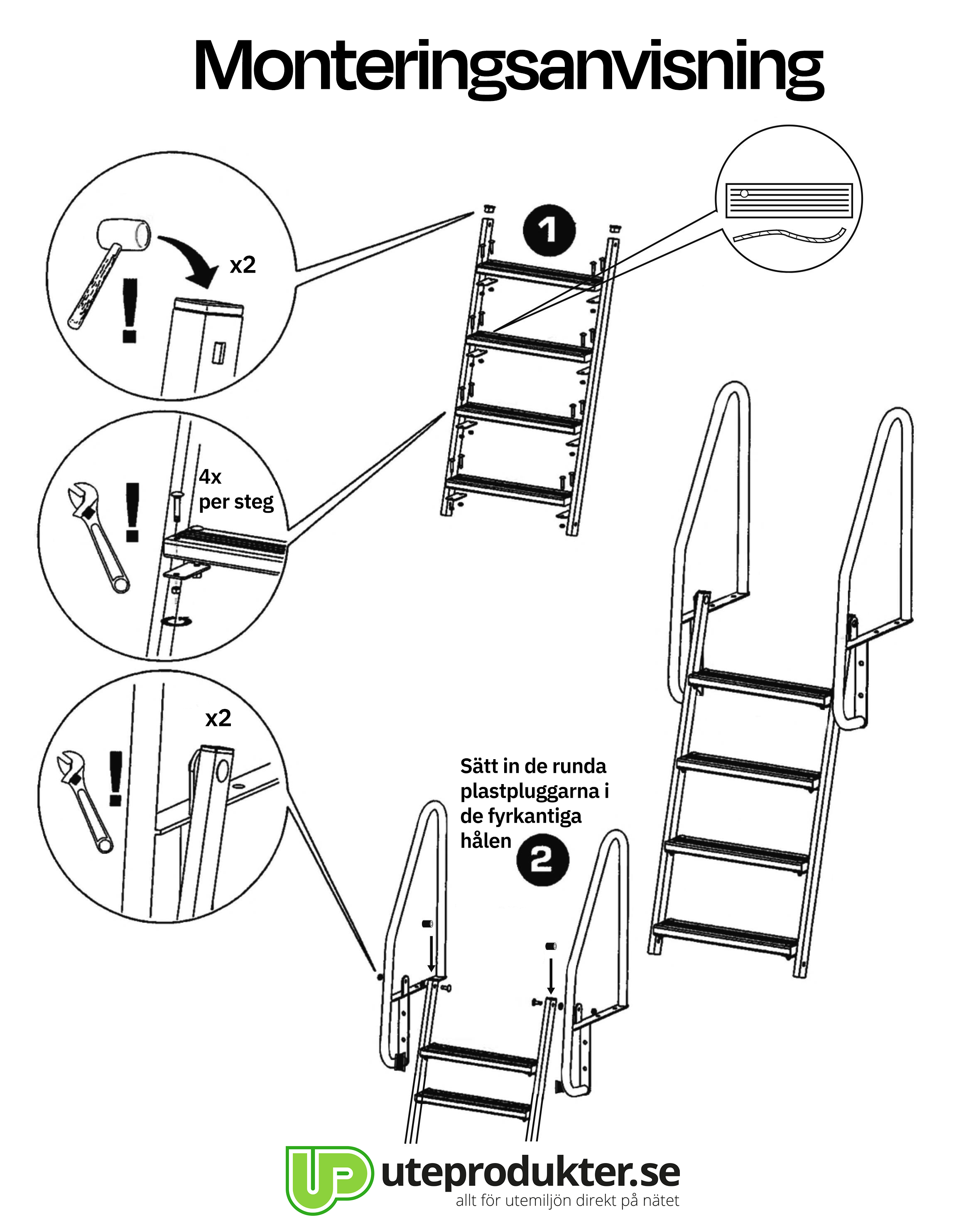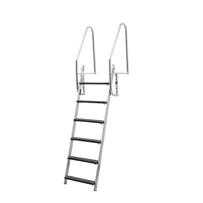 En byggstege med sex steg som är perfekt för högre bryggor som även kan förlängas med ytterligare tre steg med hjälp av förlängningssats som finns som tillval.