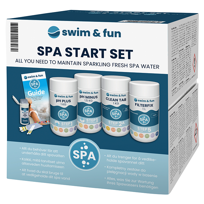 Med Spa Start-Set får du allt du behöver för en bra start på din spa-upplevelse, Setet innehåller CleanTab för att desinficera vattnet och remsor för enkel övervakning av pH- och klornivåerna. För att justera pH-nivån ingår även pH-Plus och pH-Minus. För att hålla bubbelpoolfiltret rent och effektivt ingår även Filterfix. Allt detta kommer tillsammans med en tydlig och informativ guide som hjälper dig att komma igång på rätt sätt.