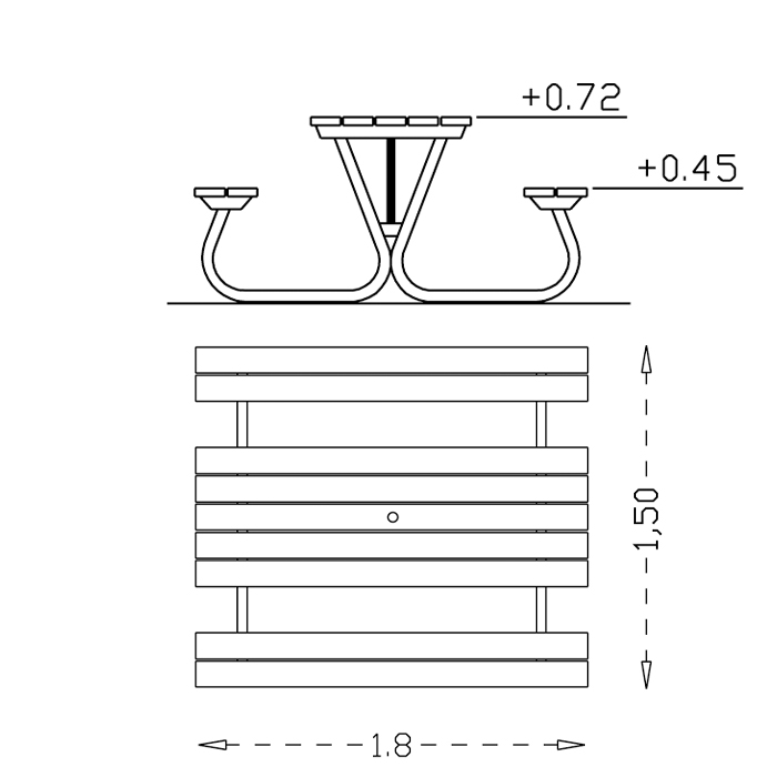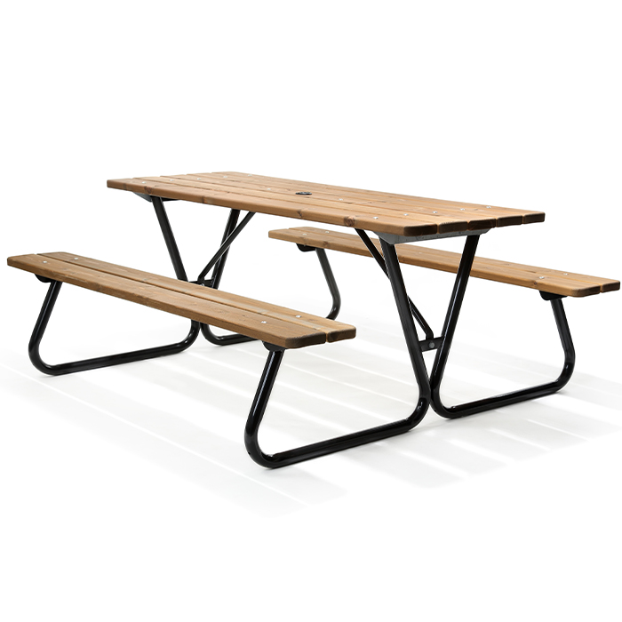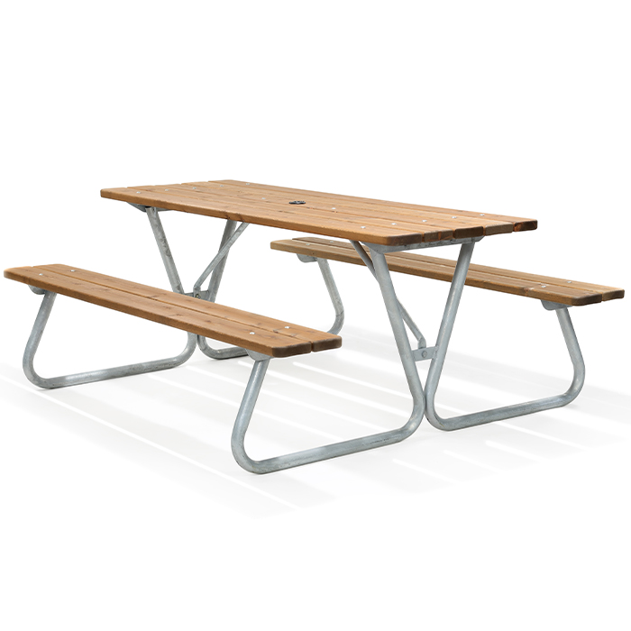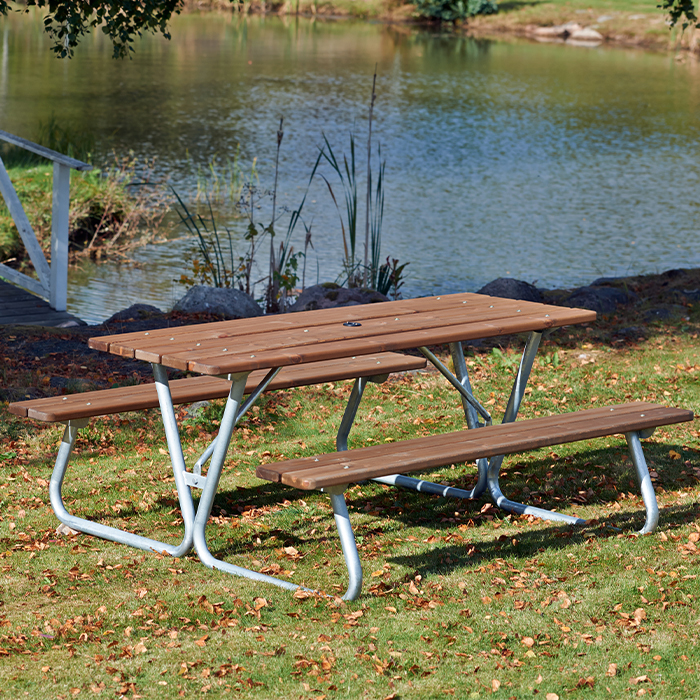 Detta klassiska robusta picknickbord med plats för upp till 8 vuxna personer. Förbättrad på en rad punkter genom åren men med bibehållen grunddesign. Passar perfekt vid arbetsplatser, kiosker, rastplatser. Sitthöjd 450 mm.