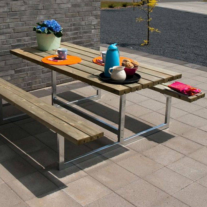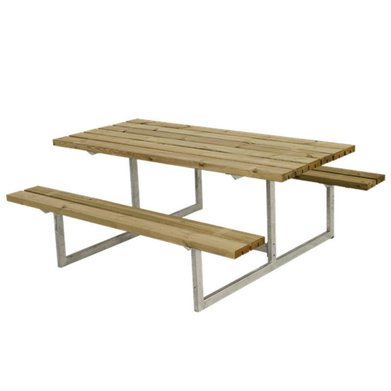 Stilrent Bänkbord tillverkat i tryckimpregnerat furu med galvaniserade stålben, finns även att få i svartmålat trä. Med det rektangulära bordskivan på 75,6 x 177 cm ger det utrymmer för cirka 8 personer att samlas runt.