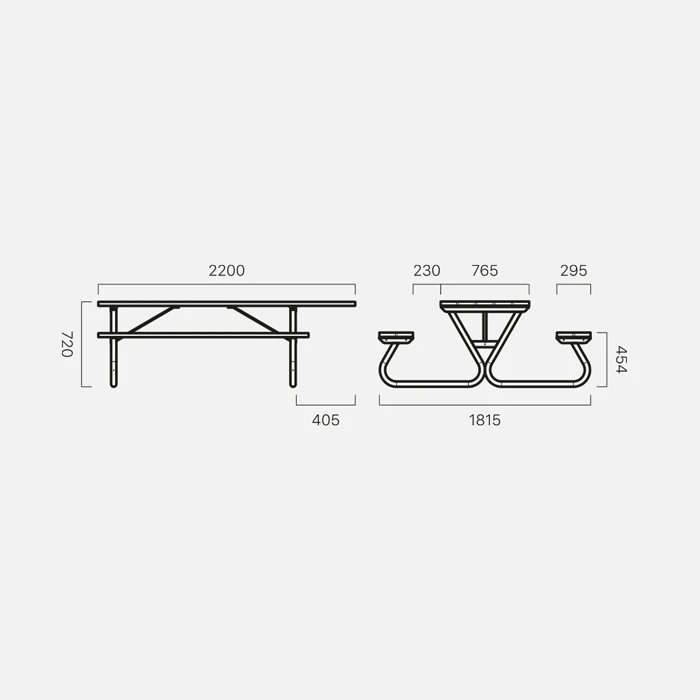 Bordet har en sitthöjd på 454 mm och en bordshöjd på 720 mm, vilket ger en behaglig och ergonomisk sittställning. Den generösa bordsytan 765x2200 mm ger gott om plats för både måltider och sociala aktiviteter. Mittenbrädan är utrustad med parasollhål (50 mm) för skugga under soliga dagar.