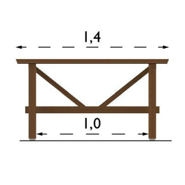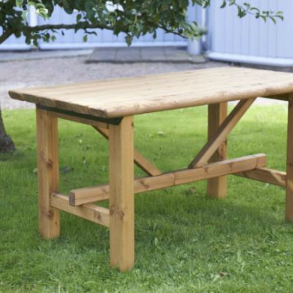 Material: Allt trä är av limmad och träskyddsbehandlad furu, bordsbrädor 45x120mm, gavlar 68x93mm. Laserat med trippelbehandling.