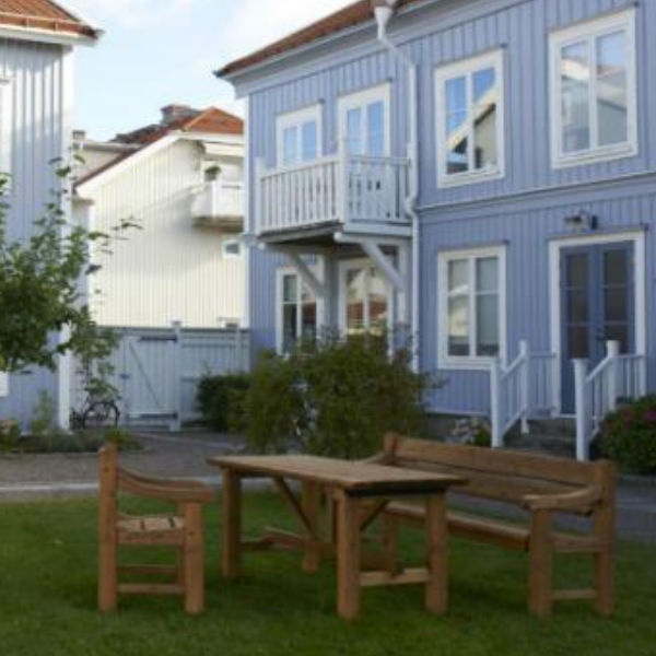 Möbelgrupp inspirerad av den engelska stilen. Bordet England är uppbyggt på ett stadigt underrede och skivan har väl avrundade och fasade kanter. Virket är träskyddsbehandlat och därefter laserat tre gånger, vilket borgar för lång livslängd. Benen försedda med konstruktivt rötskydd i form av plastfötter. England är ett robust bord som klarar tuffa miljöer.