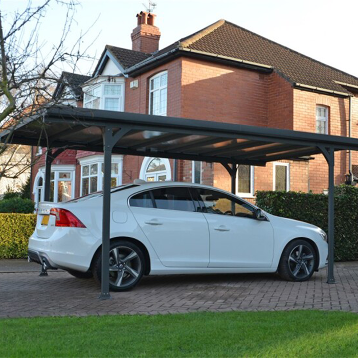 Ramen är tillverkad i pulverlackerat aluminium och galvaniserat stål som är rostbeständigt och underhållsfritt. Carporten skyddar din bil från nederbörd, hagel, UV-strålning och fallande löv, och dess moderna design gör att den passar väl till de flesta hus. Den är helt UV-skyddad, kräver inget underhåll och kan enkelt rengöras med vattenslang eller sköljas ren av regnet.