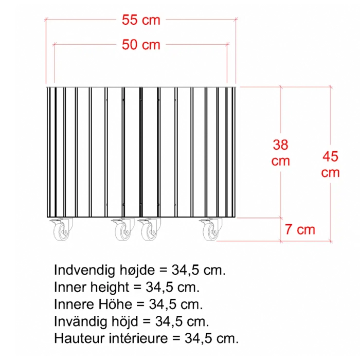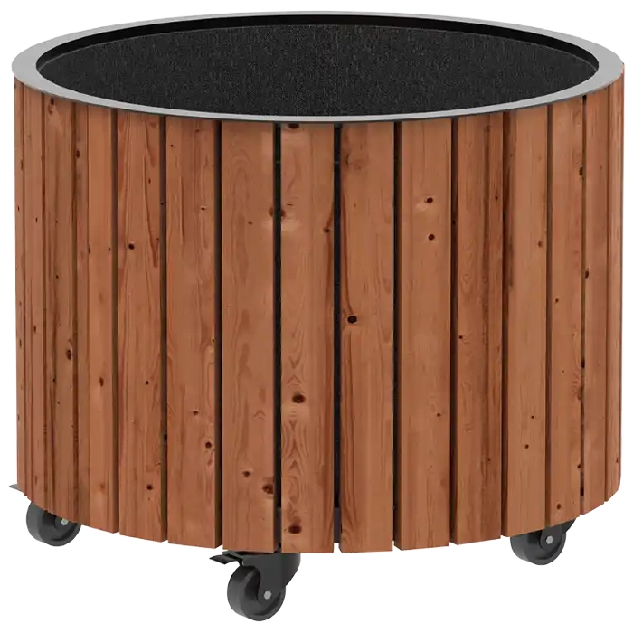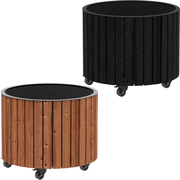 Circle är byggd för att hålla. De robusta ståldelarna, galvaniserade och pulverlackerade i svart (RAL 9005), ger en stilren kontrast till träet och skyddar mot väder och vind. De fyra smidiga hjulen (Ø50 mm), varav två med broms, gör lådan enkel att flytta och placera efter behov.