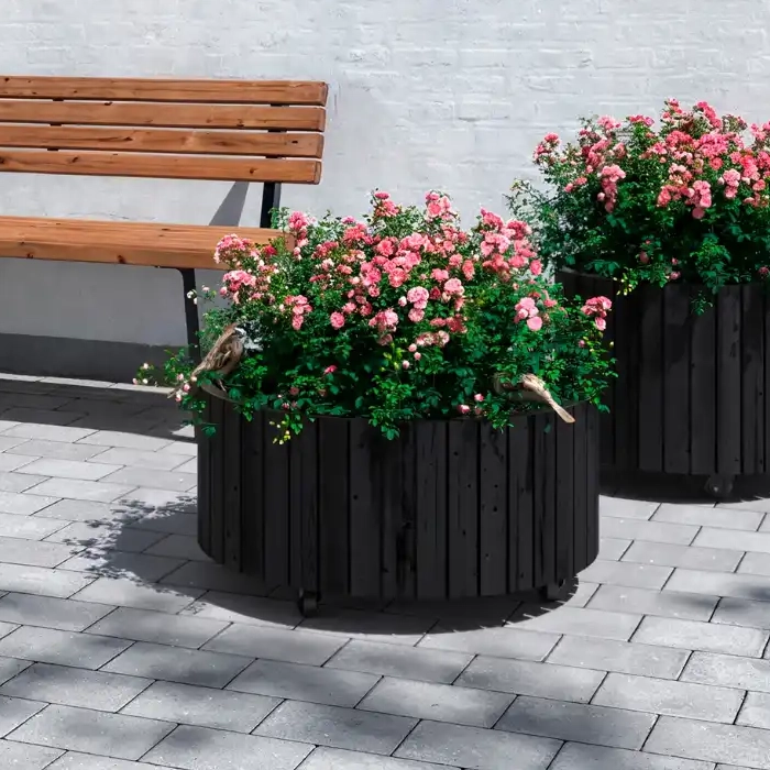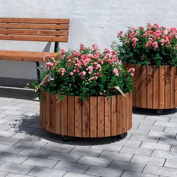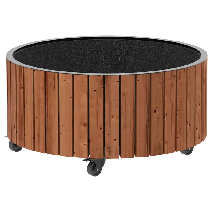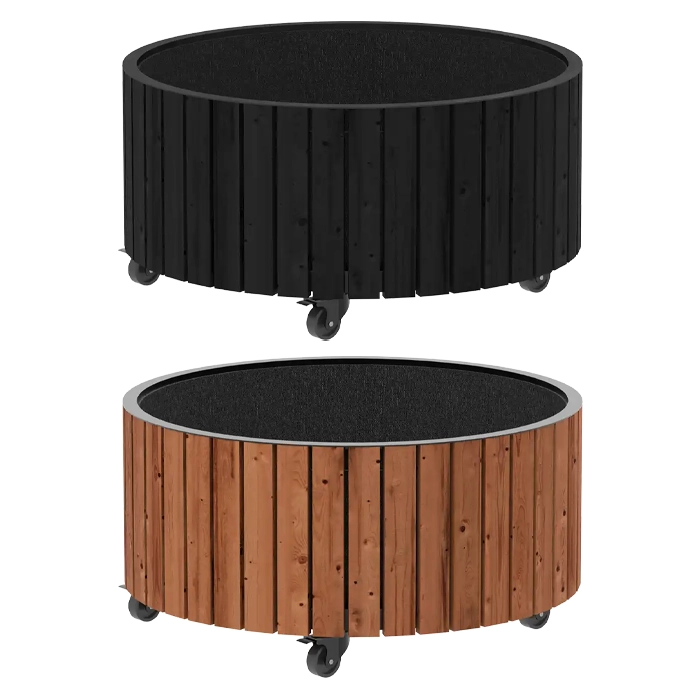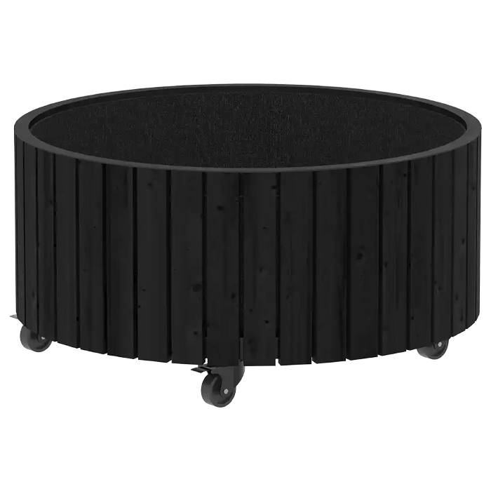 Circle planteringslåda med en diameter på 70 cm och en höjd på 35 cm med hjul är en stilren och praktisk lösning för dig som vill odla blommor, växter, grönsaker eller örter. Den eleganta designen med vertikala träribbor smälter naturligt in i dagens trädgårdstrender och skapar en harmonisk känsla på altanen, terrassen eller vid entrén. Planteringslådan finns i två utföranden: ThermoWood, ett värmebehandlat furuträ som är både hållbart och vackert, samt svartmålat virke för en modern och stilren look. ThermoWood kräver inget underhåll men förändras med tiden till en elegant grå nyans, och för den som vill bevara den varma träfärgen går det utmärkt att behandla ytan med olja.