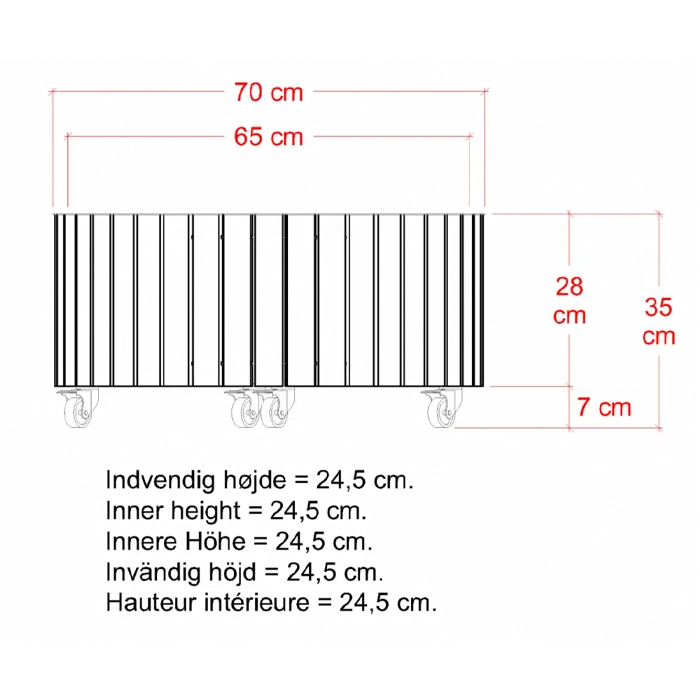 Förutom sin estetiska design är planteringslådan konstruerad med funktionalitet i åtanke. De smidiga hjulen (Ø50 mm) med bromslås gör den enkel att flytta vid behov och ger samtidigt en bekväm arbetshöjd som skonar knän och rygg. Den passar lika bra för att skapa en liten köksträdgård som för att fungera som rumsavdelare eller avskärmning på uteplatsen. Lådans över- och underdel är tillverkade av galvaniserat och pulverlackerat stål i elegant svart enligt RAL 9005, vilket ger en slitstark och vädertålig konstruktion. Träribborna är 19×45 mm och lådan levereras färdigmonterad på band tillsammans med en rund, svart PE-planteringspåse för enkel plantering. Produkten levereras som ett "Montera själv"-paket, vilket gör det enkelt att komma igång med din odling. Med Circle planteringslåda kombineras design och funktion på bästa sätt för en grönare och mer trivsam uteplats.