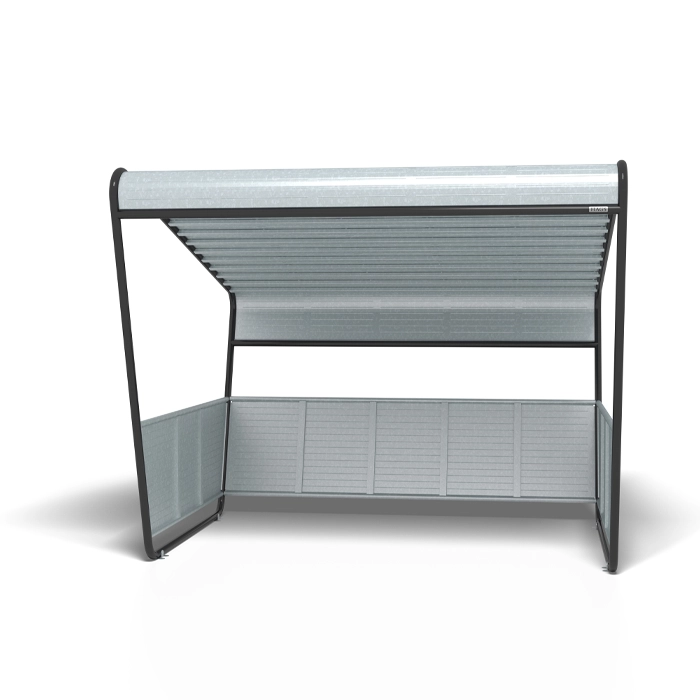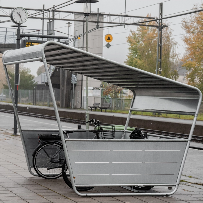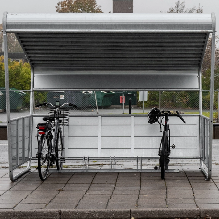 Slipp blöta sadlar och väderbitna cyklar med Atria cykelgarage, en elegant och praktisk lösning som skyddar din cykel från regn, vind och smuts. Konstruktionen består av ett robust tak och sidopaneler som skapar en trygg och stilren parkeringsplats.