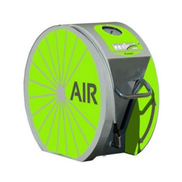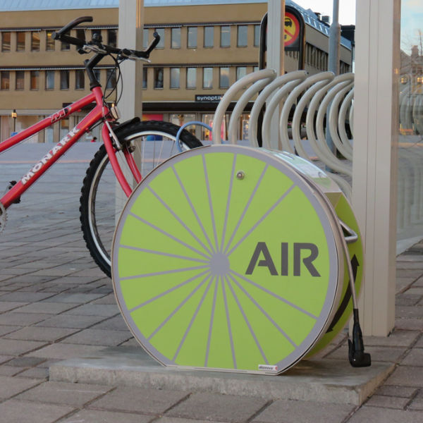 En fotmanövrerad cykelpump utan kompressor tillverkad för att klara tuffa tag i den offentliga miljön..