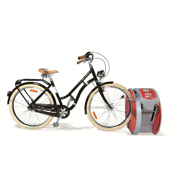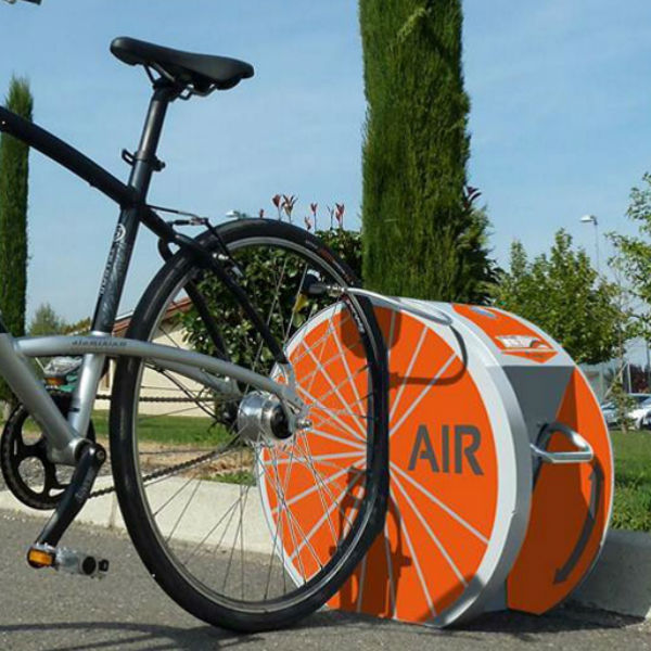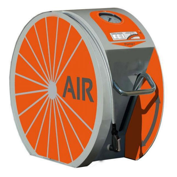 En fotmanövrerad cykelpump utan kompressor tillverkad för att klara tuffa tag i den offentliga miljön..