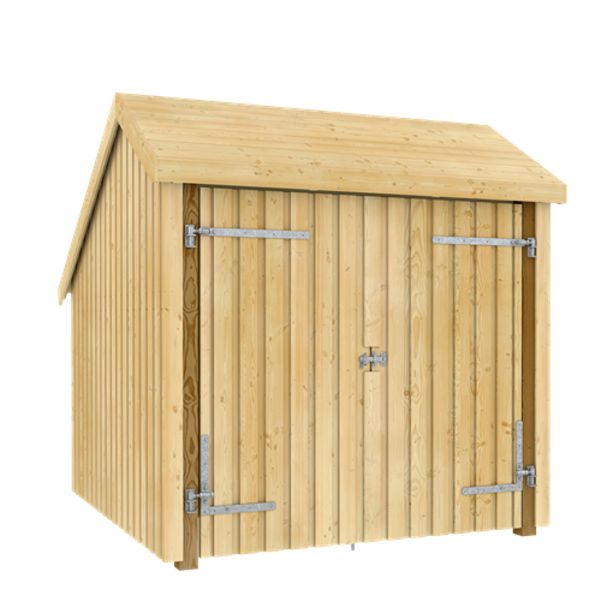 Skjulet levereras komplett inklusive alla nödvändiga beslag och skruvar med sidor och gavlar som förmonterade sektioner.