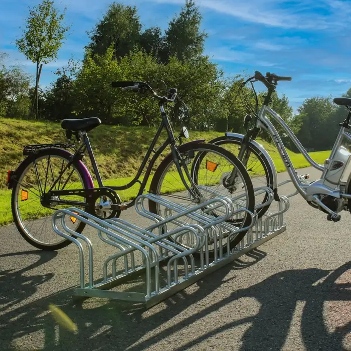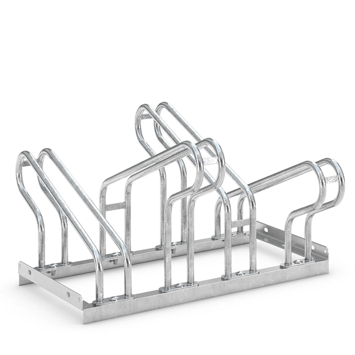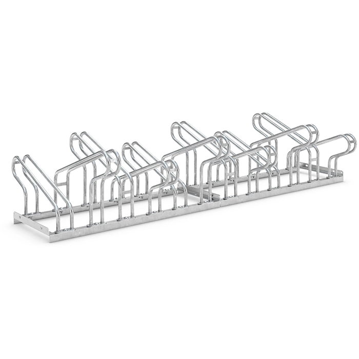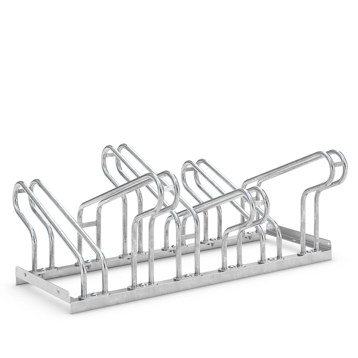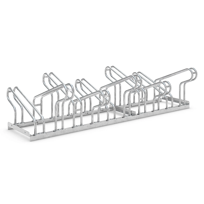 Cykelställ där man kan parkera cyklar från båda hållen i hög kvalité med vartannat högt och lågt ställ för att maximera antal platser på ytan. Stället är tillverkad av en stabil varmgalvaniserad stålkonstruktion med rundande bågar. Varje hållare är 55 mm breda för att även mountainbikes ska kunna parkeras.