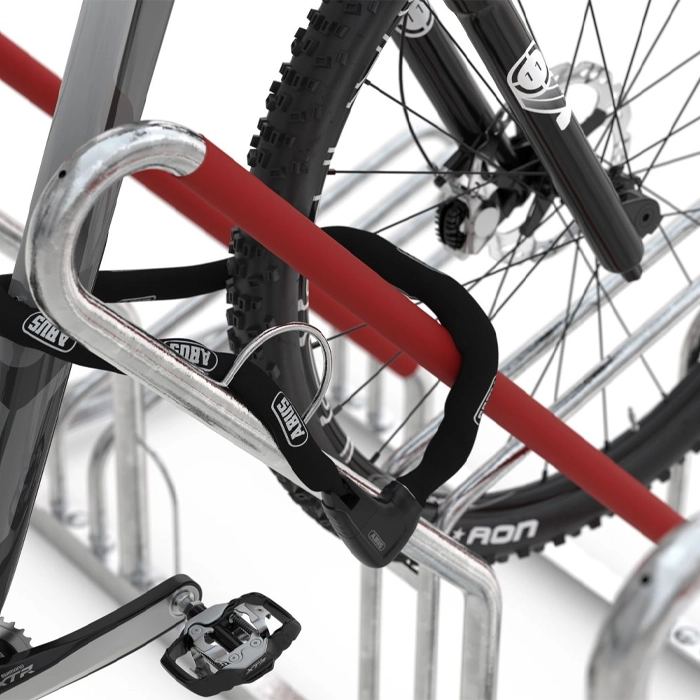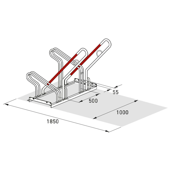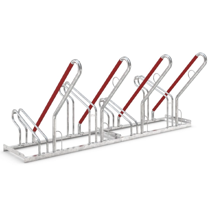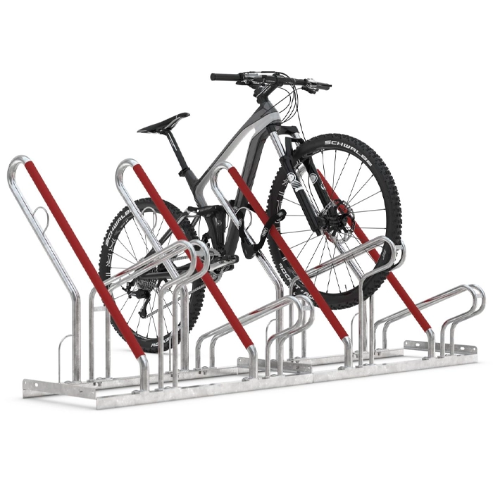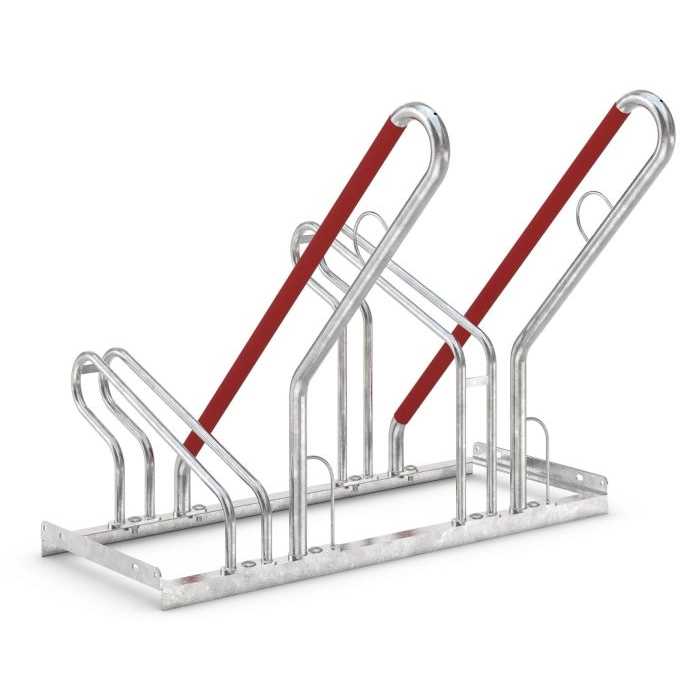 Rejält cykelställ med extra utrymme mellan bågarna (50 cm) i varmgalvaniserad stålkonstruktion för bästa rostskydd. Bågarna är utrustade med röd plastfilm som skyddar mot repor på ram och fälgar. Producerat i Europa med fokus på förstklassig kvalitet