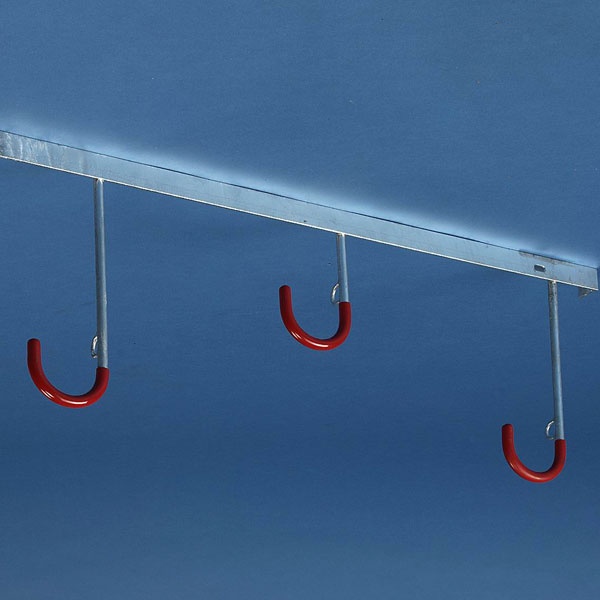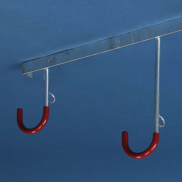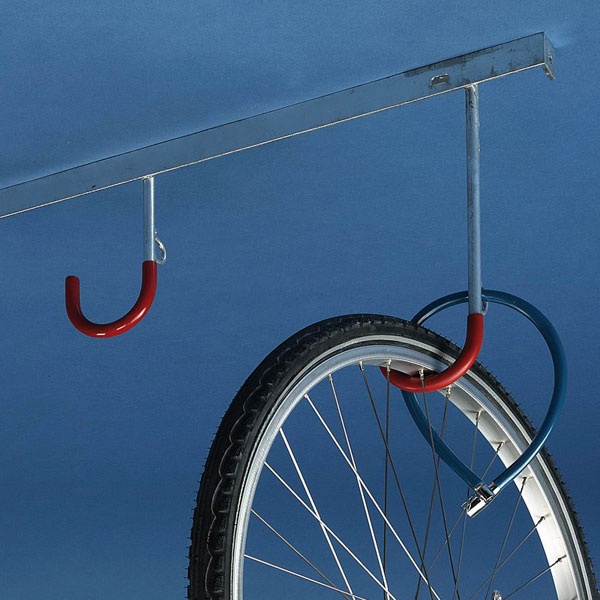 Cykelställ för hängande cyklar perfekt i t.ex. källarutrymmen med begränsat utrymme. Avstånd mellan cyklarna är endast 35 cm tack vare hängare med olika höjd.