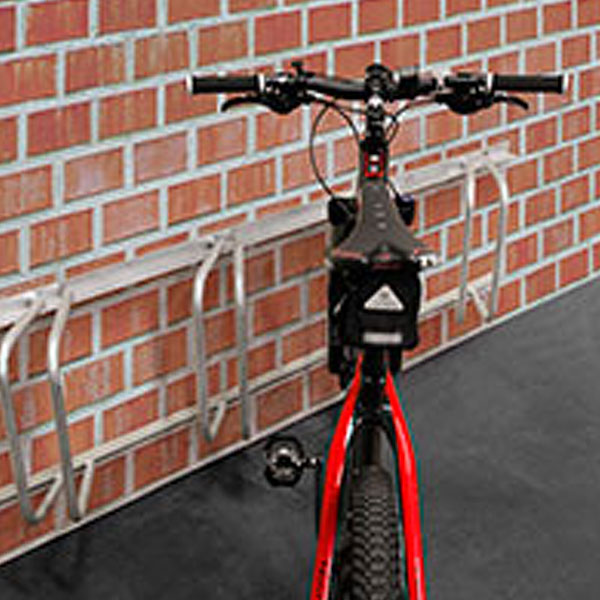 Cykelställ med raka eller snedställda hjulhållare avsett för väggmontage. Välj mellan 4 eller 5 platser samt rak eller snedställd.