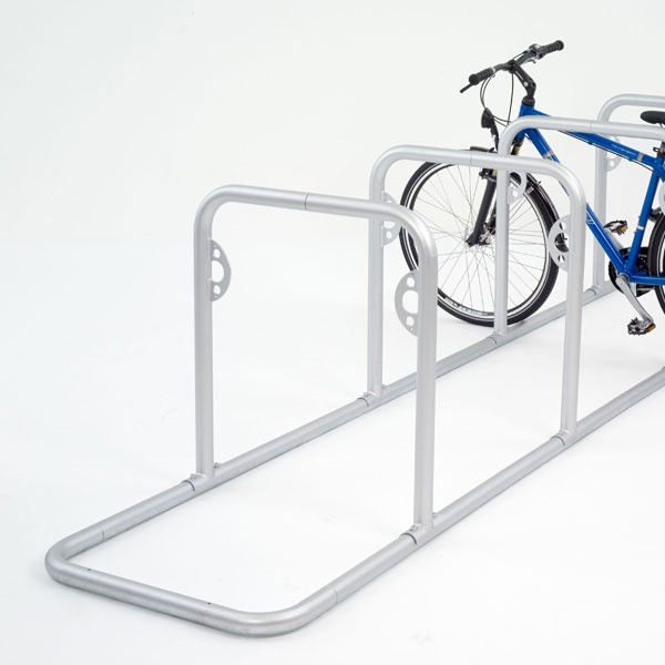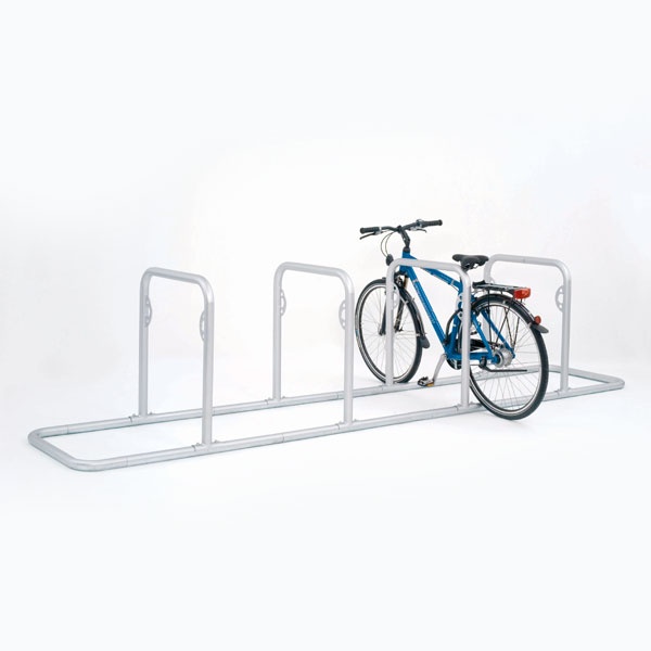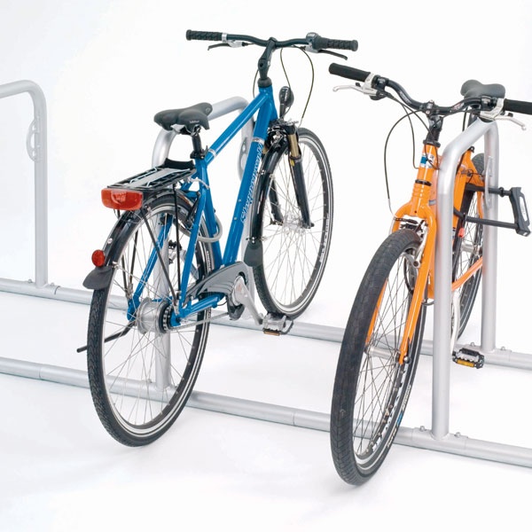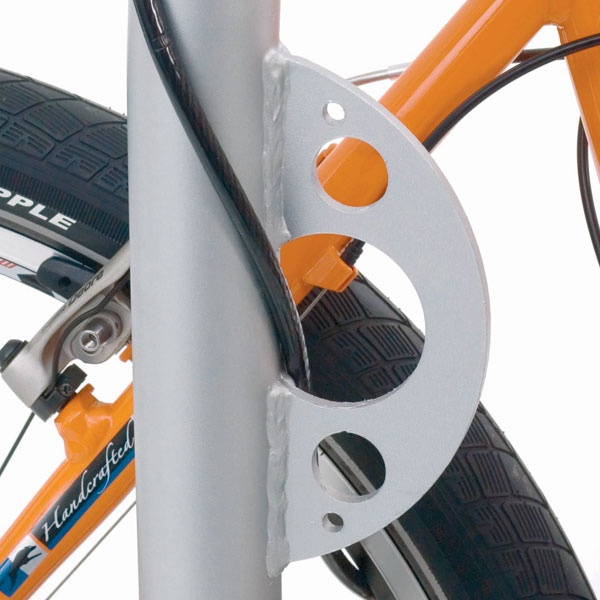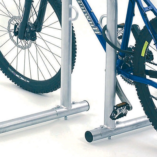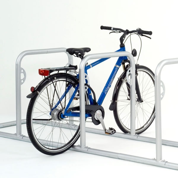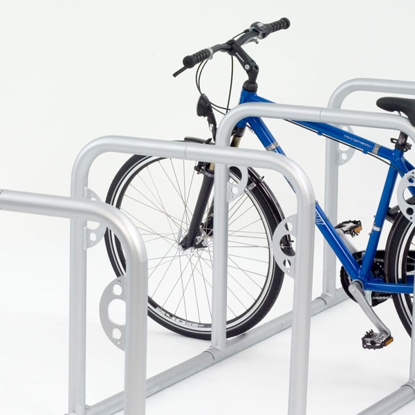 Cykelställ i modern design som gör det enkelt och smidigt att låsa fast cykeln. Stabil konstruktion med bästa rostskyddet genom varmgalvaniserat stål med 48 mm rördiameter.