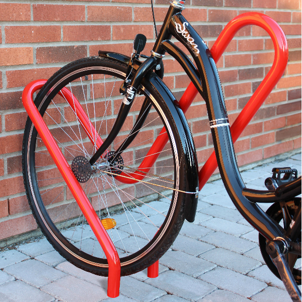 Cykelstället Hjärtat ger, med sin form, ett trevligt inslag i offentliga utemiljöer. Detta cykelställ är format som ett utdraget hjärta vilket gör att man kan låsa fast både cykelns hjul och ram i det.