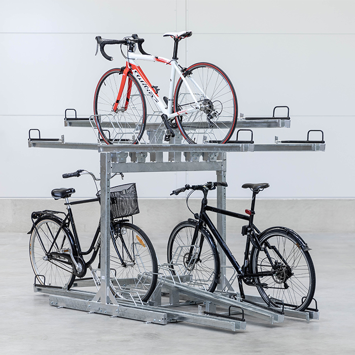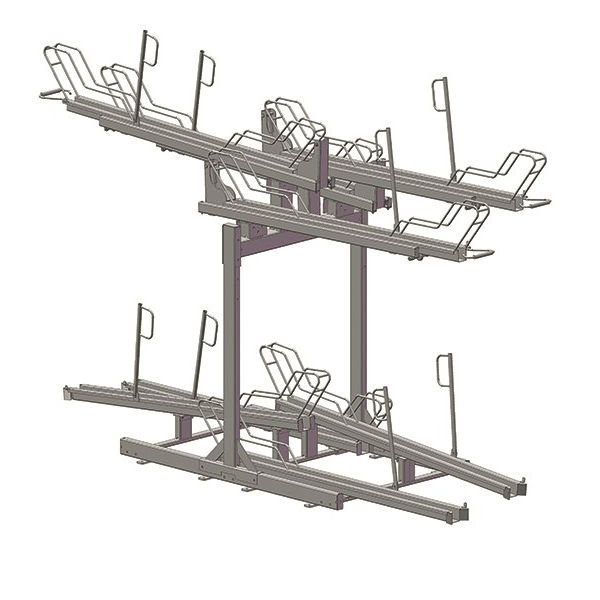 Med detta varmförzinkade cykelställ i två plan kan man från båda hållen parkera cykeln vilket gör att man får på ett effektivt sätt plats med fler cyklar på ytan. Detta dubbelsidiga ställ är mycket effektivt vid platser där utrymmet är begränsat eller där man vill maximera antalet cykelparkeringar.