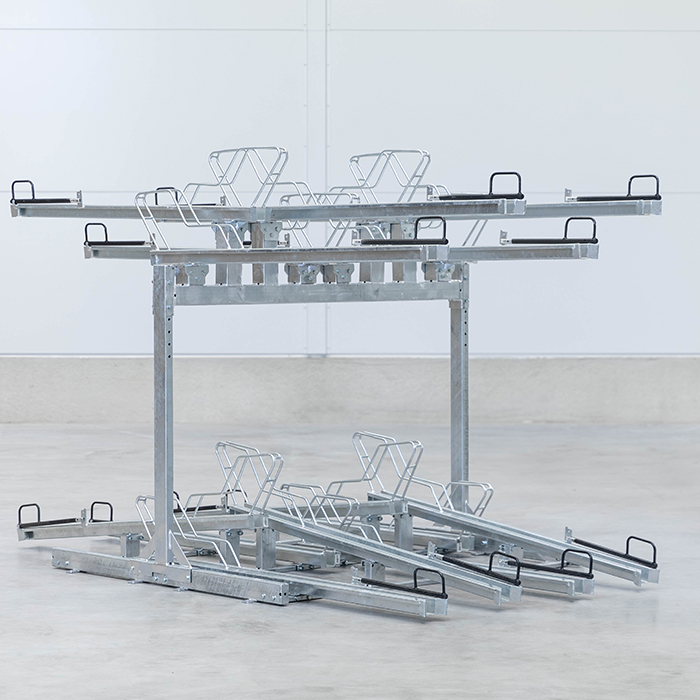 På denna modell parkeras cyklarna på det övre planet genom att lyftas upp på hand (ingen utdragbar skena).