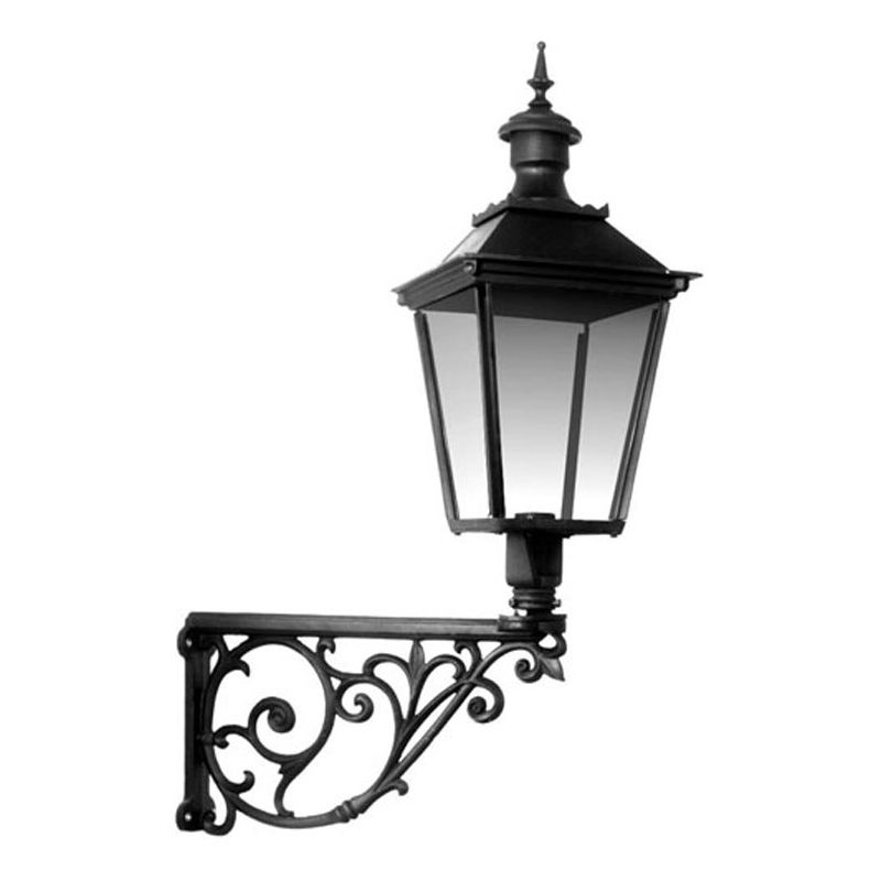 En stor fasadbelysning i hantverkmässigt tillverkad helt i gjutjärn, passar utmärkt till större hus och slott. Med fyra sidor av klarglas lyser denna belysning upp stora ytor.