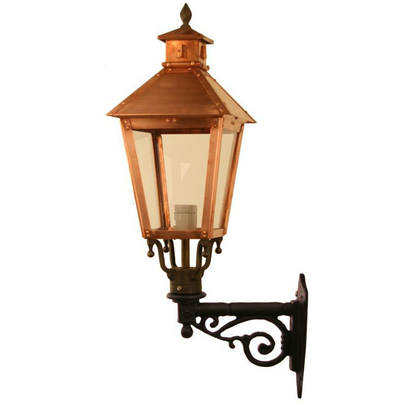En stilren handsmidd kopparlykta för fasader, ger en vackert sken från sitt lykthuvud som ger ett gediget och tidlöst uttryck.
