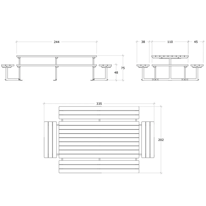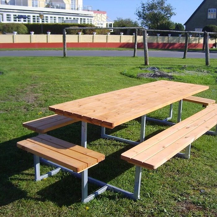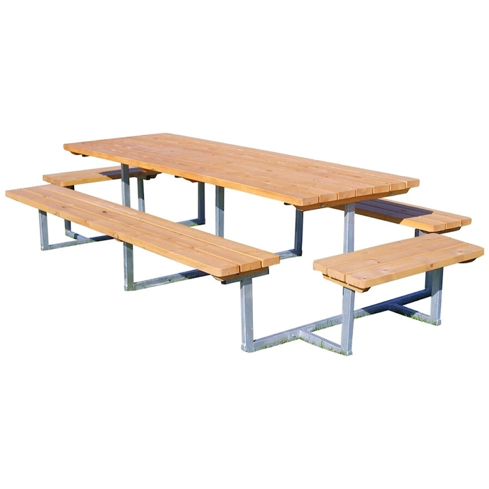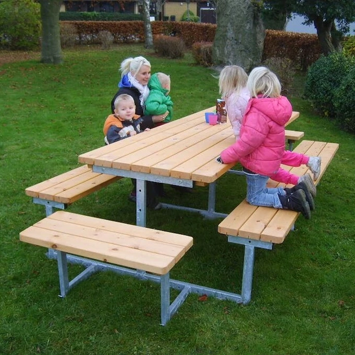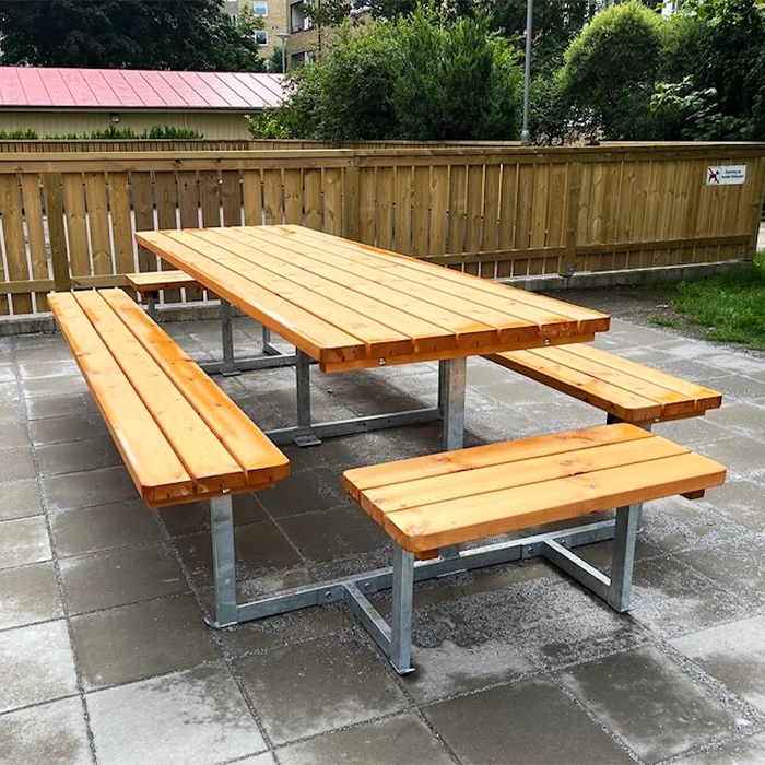 Freida är ett kraftigt och rejält bänkbord som rymmer stora sällskap med plats för upp till 16 personer. Bordet är tillverkat av svensk brunlaserad furu och har en stabil stomme av varmförzinkat stål, vilket gör det både hållbart och slitstarkt. Konstruktionen är förberedd för montering i underlaget, vilket gör det till ett perfekt val för förskolor, skolgårdar och andra offentliga miljöer.