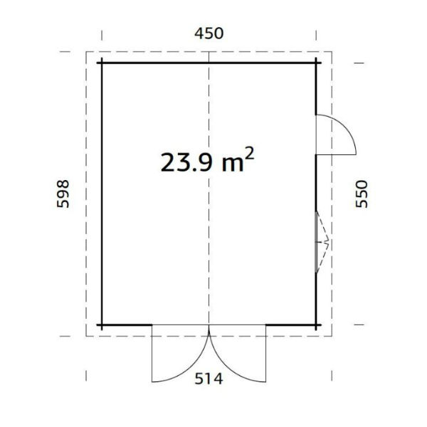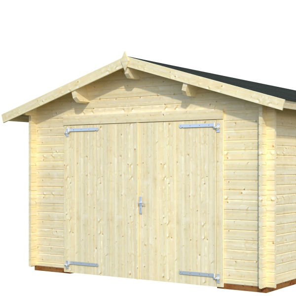 I detta utförande ingår dubbeldörrar i trä. Takbeläggning och golv ingår inte i leveransen. Takpapp samt spik beställs separat.