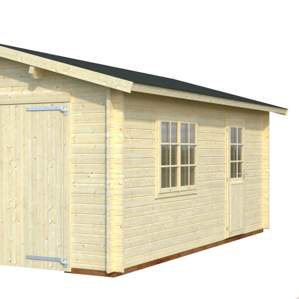 Garaget som kommer i en byggsats är enkelt att montera för den händiga. Grunden består av knuttimrat virke med en tjocklek på 44mm bestående av nordisk gran. Garaget är utrustad med en fönsterdörr samt ett fristående öppningsbart fönster, både är beklädda med spröjs.