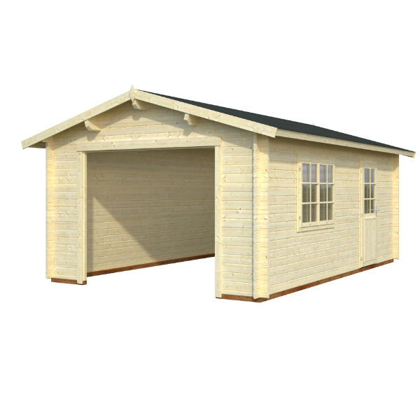 Garaget som kommer i en byggsats är enkelt att montera för den händiga. Grunden består av knuttimrat virke med en tjocklek på 44mm bestående av nordisk gran. Garaget är utrustad med en fönsterdörr samt ett fristående öppningsbart fönster, både är beklädda med spröjs.