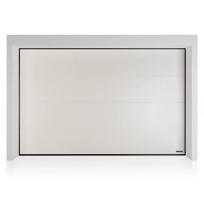 Med sin släta, pulverlackerade yta i den tidlösa färgen Vit (RAL 9016) får garaget ett modernt och stilrent uttryck. Materialet är galvaniserat stål, vilket ger ett starkt skydd mot rost och gör ytan enkel att underhålla. För din trygghet är panelerna dessutom utformade med ett integrerat klämskydd som minimerar skaderisken vid användning.