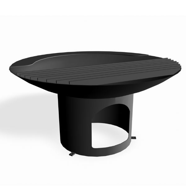 Hilde är försedd med ett tätt grillgaller och avlastingsyta på ena sidan samt ett avrinningshål i mitten. Grillen kan eldas med både ved eller kol.