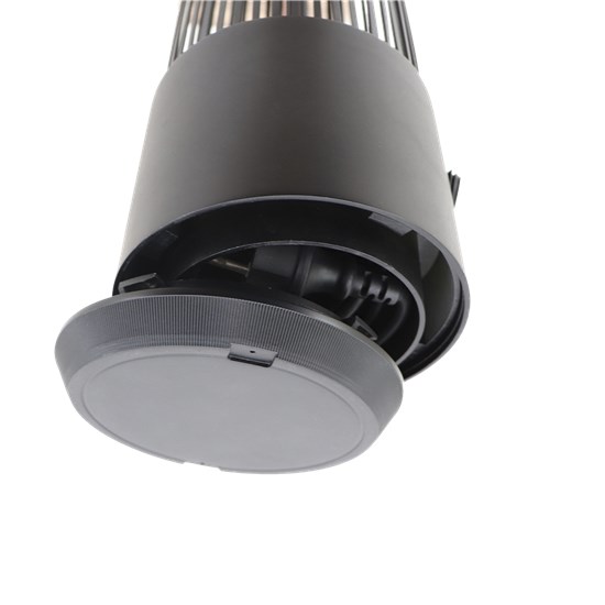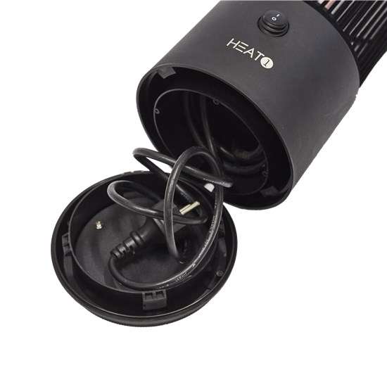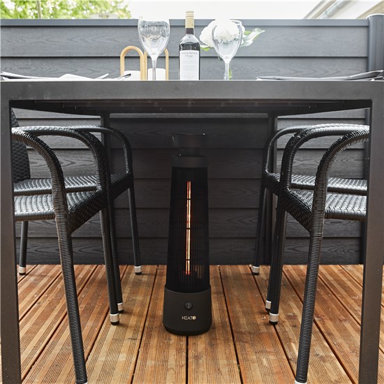 HEAT1 ECO high-line terrassvärmare tillverkad för att placeras under bord. Modellen har en konisk utformning i modern design vilket gör värmaren till en möbel i sig. Modellen placeras ut under trädgårdsbordet för att säkerställa härlig värme, så att du kan njuta av en trevlig sommarkväll på terrassen utan att frysa om benen. Värmaren sprider värme 360 grader med en kortvågig, infraröd, ultra low glare-teknologi. Då modellen endast väger ca. 3,5 kg kan den enkelt flyttas runt så att du kan använda den på flera olika platser, där ett eluttag är tillgängligt. Botten och toppen är gjorda av pulverlackerat stål och det svarta röret är tillverkat av aluminium. Den inbyggda "vältsäkringen" bryter strömmen om terrassvärmaren välter. Strömmen återställs när terrassvärmaren ställs upp igen. Sladden förvaras elegant i botten av terrassvärmaren. "Cone" levereras med