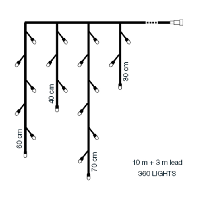 Ice är en dekorativ istapsslinga med nerhängande istappar i längder från 30 cm till 70 cm med en total längd på 10m (+3m startkabel). Denna slinga passar bra längs takskägget, uppe på hängrännan eller inte längs muren/staketet.