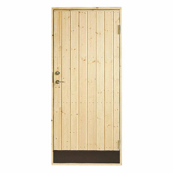 Kallförrådsdörr 10° tillverkad av rak furupanel med svart sparkplåt nertill. Dörren är vänsterhängd med måttet 9x20. Karmyttermåttet är 885x1985 mm. 10°-dörrar innebär att dörren tål temperaturskillnad mellan ute- och inneluft på 10 grader. Denna dörr lämpar sig perfekt för ouppvärmda förråd och friggebodar.