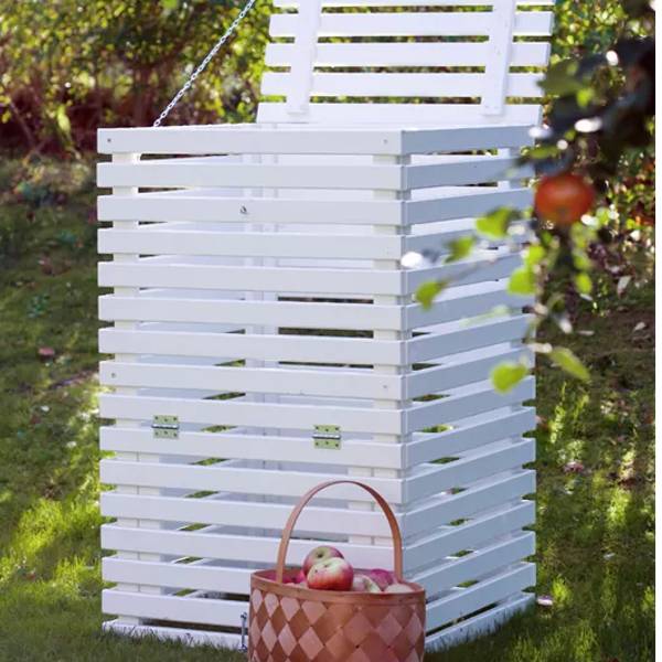 Kompost tillverkad av karaktäristiska ribbor i vitmålad gran. Komposten har en volym på 340 liter och är försedd med lock och rostfria gångjärn samt en praktisk lucka för att plocka ut avfall i botten. Givetvis är komposten tillverkad av FSC®-certifierat virke för ett ansvarsfullt skogsbruk och finns tre olika färger.