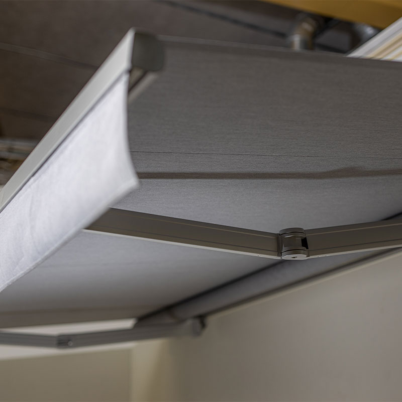 Våra terrassmarkiser ger dig möjlighet till en skuggad uteplats, såväl på den stora altanen som den lilla balkongen. Med en maxbredd på 590 cm och ett maxutfall på 350 cm kan terrassmarkisen skugga upp till hela 20 kvadratmeter. Manövrering sker med utvändigt monterad vev.