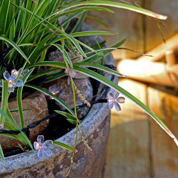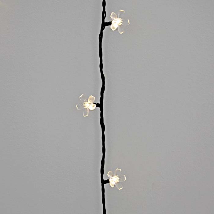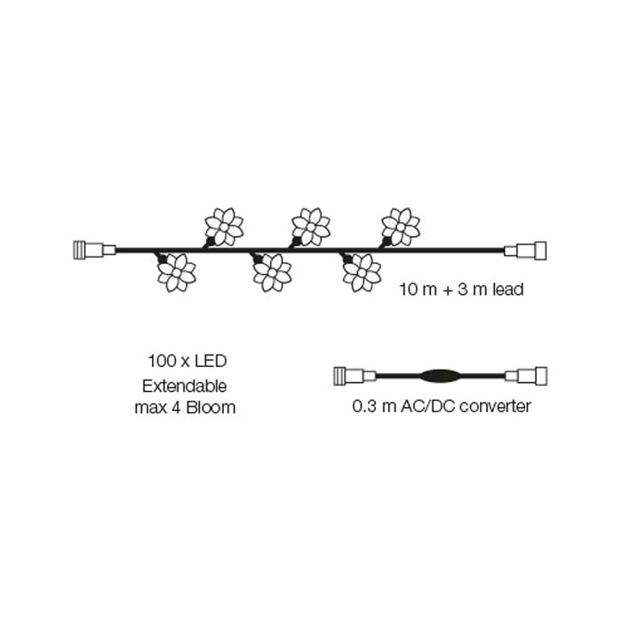 En stämningsfull ljusslinga med små transparenta blommor vid varje ljusdiod (totalt 100 st LED), utmärkt för uteplatsen eller trädgården. Linda slingan runt ett träd eller en pergola, eller lägg ner den lite löst bland växterna i en kruka möjligheterna är många!