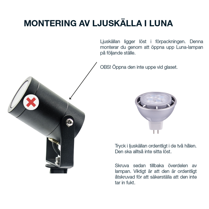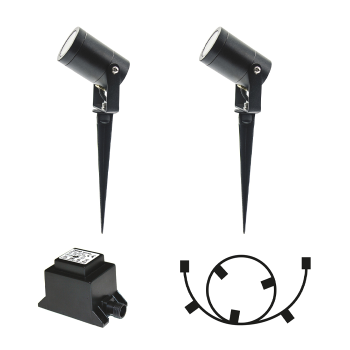 Ett startpaket med två stycken Luna markspottar för trädgården där det ingår en 5m grenkabel & en transformator 60w som är lite starkare för du ska kunna bygga ut ditt ljussystem i framtiden. Luna är en allround spott med en bra ljusspridning för små till mellanstora träd, buskar och statyer. Tillverkad av aluminium som sedan är pulverlackad för att tåla de nordiska klimatet.